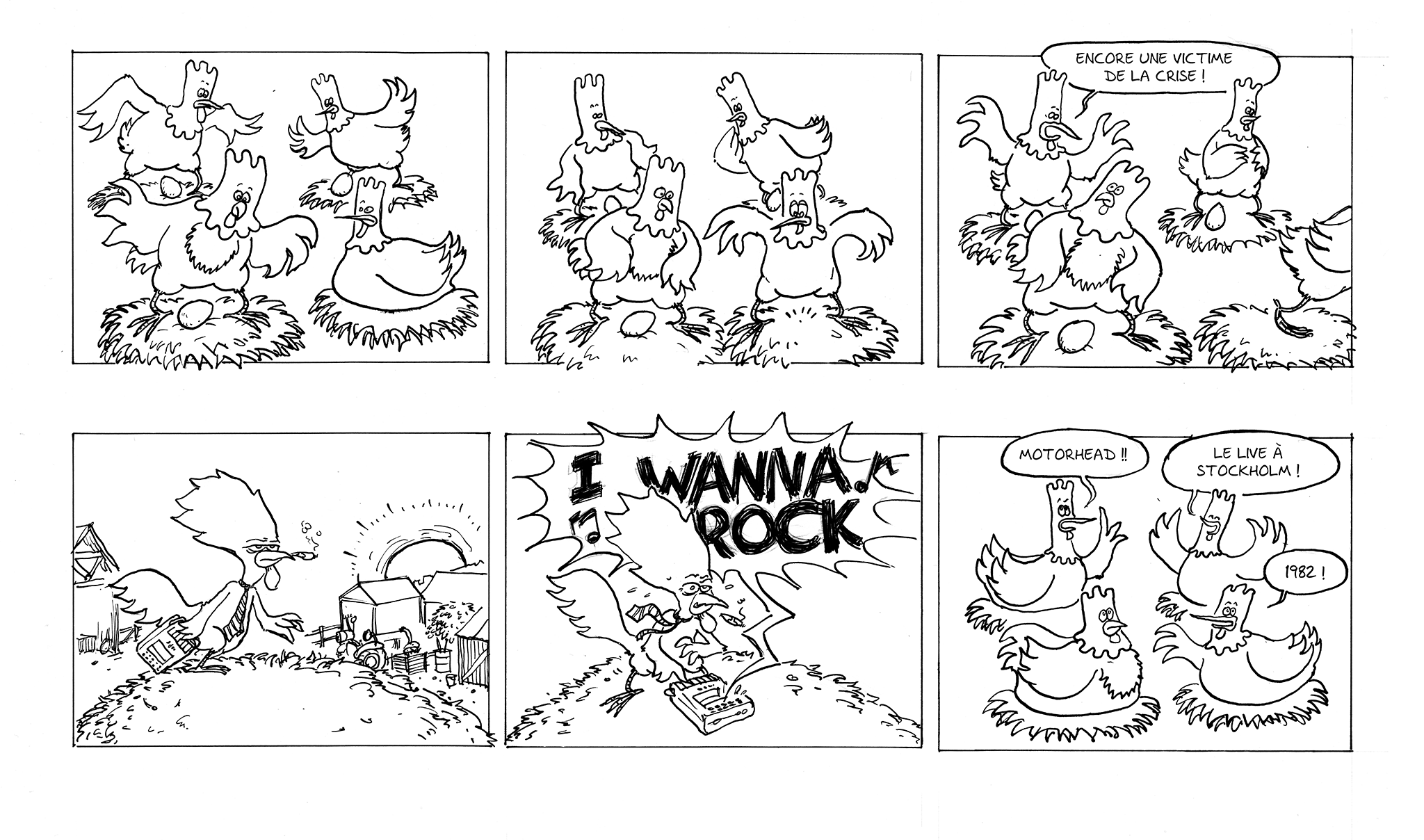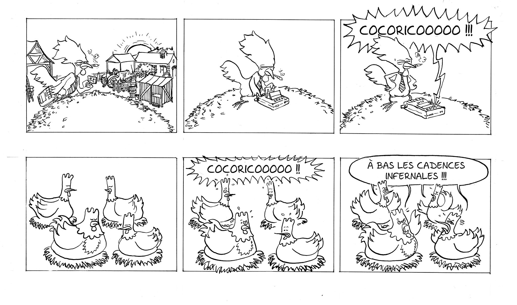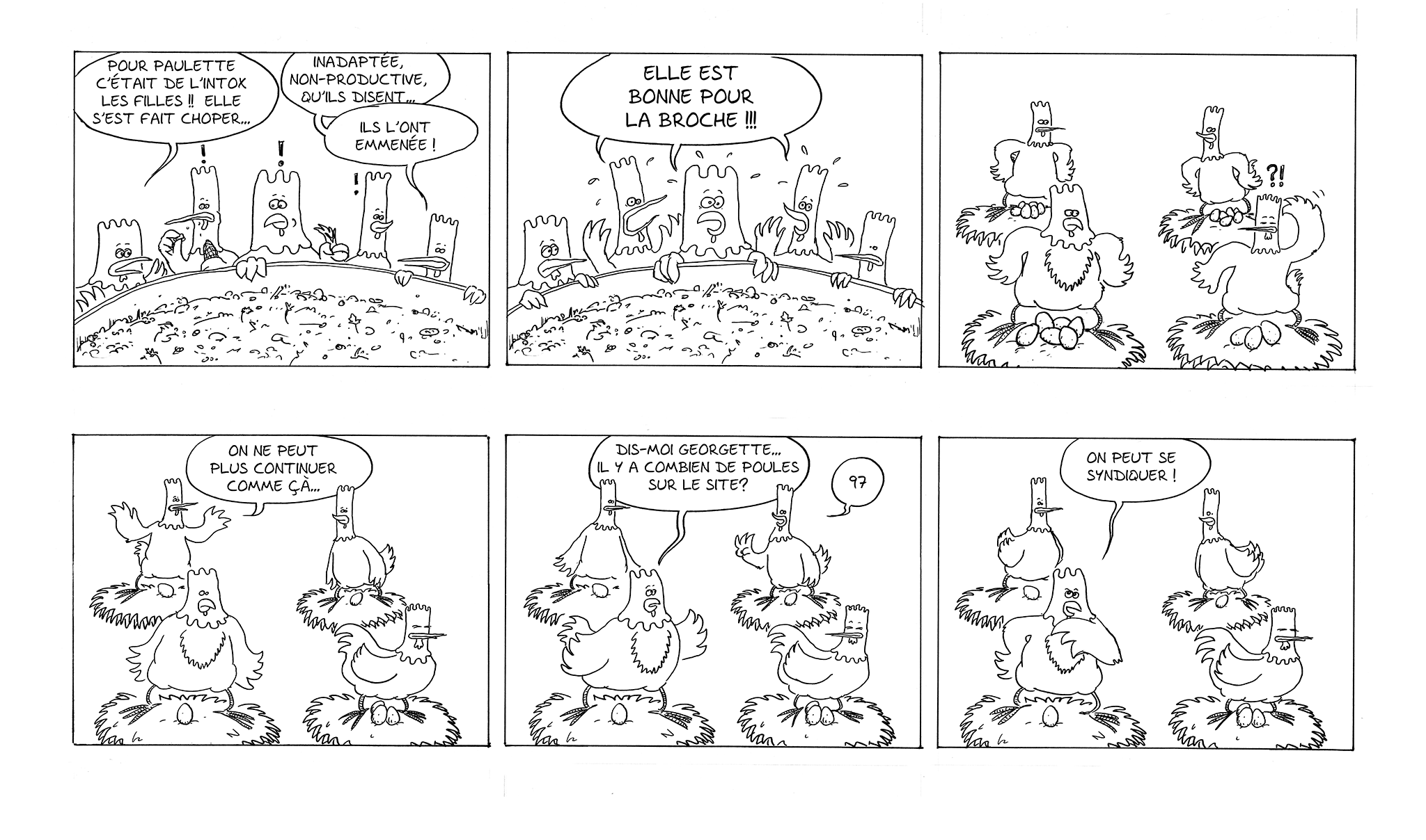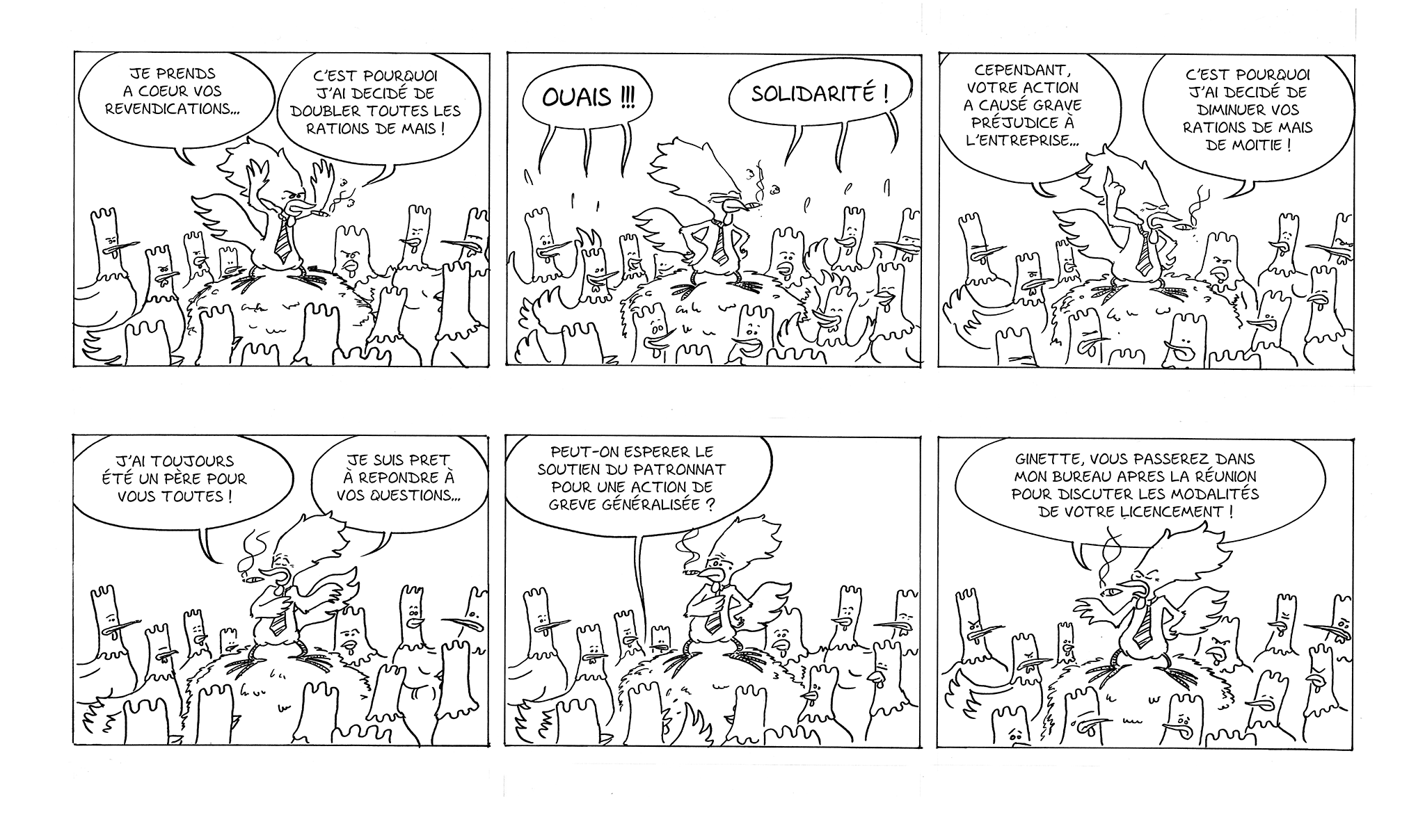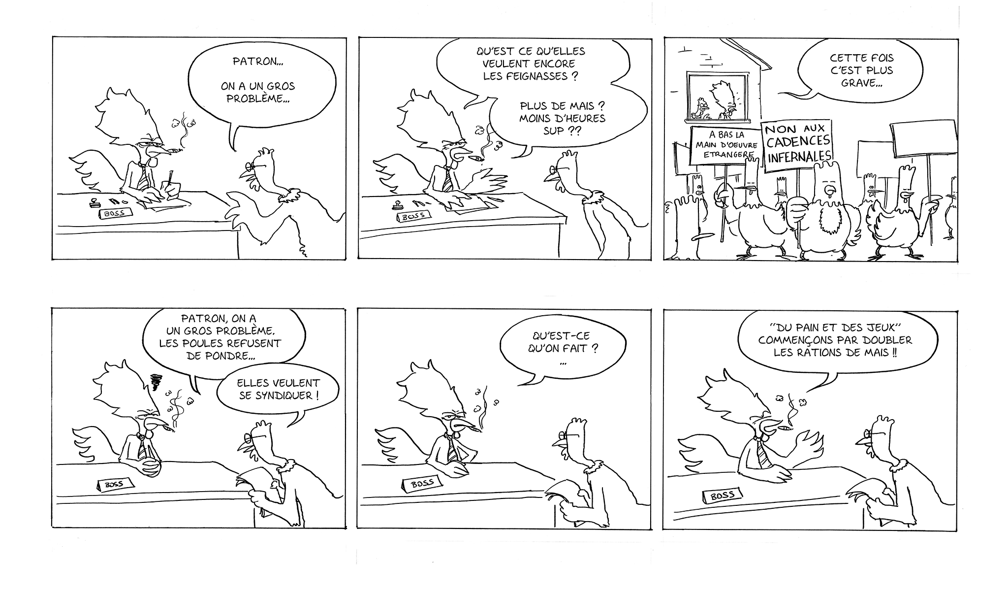 Quelques pages du début d’une BD écrite par mon ami Bruno, qui visait à aborder des enjeux sociaux au travail, tels que les conditions des travailleurs, le burnout et l’immigration.